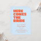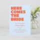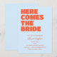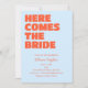 This bridal shower invitation features oversized bold orange type stacked down a soft light blue background with the bride's name in flowing script and all the party details below. Fun, loud, and impossible to miss — a great fit for a bride who loves a bold, graphic look.