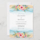 This watercolor design captures a serene coastal atmosphere with soft turquoise waves and sandy washes. Vibrant pink hibiscus and yellow plumeria flowers bloom alongside lush green monstera and palm foliage. The artistic palette evokes a warm, airy seaside destination feel, perfect for a romantic summer event by the ocean.