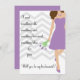 Um design moderno com uma dama de honra que veste um vestido roxo ou um vestido do lilac curto. Está guardarando um buquê de flores da tulipa. Está olhando à moda enquanto veste uma colar de harmonização, os saltos altos e os seus restos do cabelo livremente em seus ombros. O fundo é listras modernas do ziguezague da viga em uma cinza subtil. O texto lê-o "algo velho, algo novo, algo pedido, algo azul e. Você será minha dama de honra?" Este cartão é pedindo que alguém seja uma dama de honra, florista, madrinha de casamento ou o outro membro do partido nupcial em seu casamento. Você pode adicionar uma mensagem pessoal à parte traseira clicando na personalização a botão. Este design está disponível em uma variedade de cores, assim como em tons de pele e em cor do cabelo. Se você não encontra o que você está procurando apenas a mensagem mim.