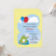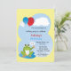 Um convite para festas de aniversário para crianças com uma ilustração original de um sapo verde numa almofada de lírio com balões vermelhos e azuis.
