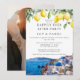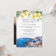 Este convite de casamento de festa feliz para sempre, com limões aquarela e uma cena de Santorini, Grécia, pode ser personalizado com suas informações em tipografia elegante e foto especial no verso. Projetado por Thisisnotme