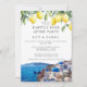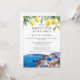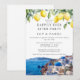 Este convite de casamento de festa feliz para sempre elegante, com limões de aquarela e uma cena de Santorini, Grécia, pode ser personalizado com suas informações em tipografia sofisticada. Projetado por Thisisnotme