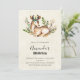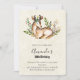 Convite de aniversário com um lindo cervo deitado cercado por flora folhosa.