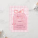 Este convite de chá de bebê de menina com laço rosa e gingham diz: "Uma doce menina está a caminho!". O convite é doce, mas elegante, com bela caligrafia e tipografia moderna em uma sobreposição de arco rosa translúcido que mostra a fita de cetim por baixo. O convite exclusivo pode ser facilmente personalizado com todos os detalhes essenciais sobre o chá. Está disponível em papel de alta qualidade e como download instantâneo. Ele prepara o cenário para um chá de bebê com tema de laço rosa, delicado e lindo para uma menina.