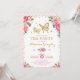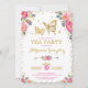 Convite feminino para festa de chá com tema de borboleta, apresentando uma ilustração linda de flores rosa e vermelho quente em aquarela e um par de borboletas douradas intrincadas