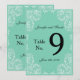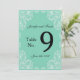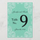 Uma moldura branca rendada torna este cartão de número de mesa para recepção de casamento uma escolha encantadora para o seu dia especial. Mostrado aqui com um fundo aqua, você pode personalizar a cor deste fundo para a cor de sua escolha para combinar com o tema e as cores do seu casamento. Edite o exemplo de texto do número da mesa mostrado aqui com seus detalhes selecionando o botão "Personalizar" e preenchendo seus dados. Você também pode alterar as fontes e tamanhos de fonte, bem como mover o texto para atender às suas necessidades. Cartões e produtos adicionais estão disponíveis neste design, incluindo convites de casamento, cartões de resposta RSVP, Save the Date, adesivos, guardanapos de coquetel e muito mais.