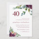 Belo e chico convite de festas de celebração botânica e verde de 40 anos de cor-d-água, apresenta um belo rosa pastel com flores roxas de lama roxa e verde, e uma frente branca com elegante 40 tipografia e flores com folhagem.