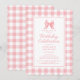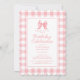 Celebre o aniversário especial com o nosso delicioso convite de aniversário rosa pastel e branco. Este design atemporal apresenta um laço rosa doce e um padrão xadrez gingham clássico. Os detalhes do evento são apresentados de forma elegante em caligrafia e letras elegantes. Além disso, o verso do convite continua o tema gingham rosa e branco.