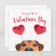 Linda ilustração do Dia dos Namorados feliz animal de estimação apresentando um cachorro curioso usando uma faixa de cabelo com coração vermelho. Saudação de feriado sazonal escrita em letras de tipografia moderna.