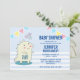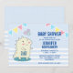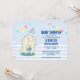 Convite de chá de bebê com um dinossauro sorridente e fofo com RAWR escrito na barriga. 3 estrelas felizes acima da cabeça dele.