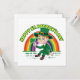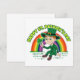 Convite com uma ilustração de um duende sorridente usando um terno verde, um chapéu-coco enquanto segura uma folha de trevo, com um arco-íris colorido ao fundo e texto dizendo "Feliz Dia de São Patrício"