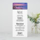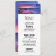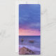 Menu de eventos com uma bela fotografia com cores marcantes de roxo, azul e rosa no pôr do sol. Uma bonito linha costeira espalhada por rochas.