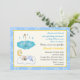 Convite de polvilhado de menino bebê dormindo azul amarelo que apresenta um menino bebê dormindo em uma nuvem. Há uma borda azul com círculos e pontos brancos. Alguns elementos por Trina Clark e cortesia de vectorportal.com.
