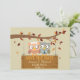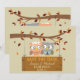 Lindo design de convite de casamento para salvar a data, estilo cartoon com noivos coruja. Por favor, personalize o texto na frente e atrás também. Se você virar o convite, você verá as costas das corujas. Design de banner de madeira pendurado para texto que será personalizado. Se você precisar de papelaria adicional, como cartões de rsvp ou agradecimento com as corujas, me avise! Cores de outono. Mais apropriado para um casamento de outono.