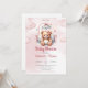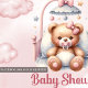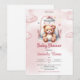 Maravilhoso design para convites de Baby Shower de menina apresenta ursinho de pelúcia rosa em berço com chupeta. Tipografia moderna de criança. Não hesite em entrar em contato comigo para itens correspondentes ou personalização. Violet Prints ©