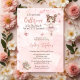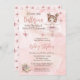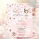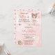 "Uma Ballerina Doce Está a Caminho e estamos entusiasmados com a TUTU!", uma bailarina e de borboletas, Chá de fraldas de borboletas ou design de Sprinkle, com álcool rosa e fundo rosa, na frente, com um padrão de borboletas rosa sobre fundo sólido rosa pálido na parte de trás.