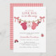 Celebrate the upcoming arrival of a sweet little love bug with this adorable baby shower invitation featuring charming ladybugs, pink gingham back, and baby bodysuits hanging from a rustic clothesline. This design is perfect for a playful yet classic baby girl shower theme.