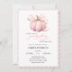 This elegant and charming baby shower invitation features a beautiful watercolor illustration of a pink pumpkin with a delicate pink ribbon, perfect for celebrating the upcoming arrival of a little one in the fall season.