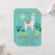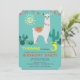 Um Convite de aniversário colorido com uma lhama engraçada em fundo de fiesta e cactos.