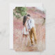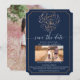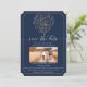 Photo Save the Date Announcement in Navy with Rose Gold Script Typography Glitter Heart. Elegant, Dark navy blue background with calligraphy script hand lettered typography artwork by Audrey Jeanne. That lettering was then transformed into rose gold glitter in a three dimensional look and surrounded by pink scrollwork swirls in the shape of a heart. The reverse side is second, full-size 5 x 7 framable photo that will be a keepsake gift to family and friends.. All artwork was created by internationally licensed artist and designer, Audrey Jeanne Roberts, copyright.