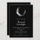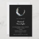 Um convite de festa de Halloween com uma ilustração mística. Uma lua azul escura com um contorno fino elegante e flores brancas ao longo das suas bordas.