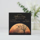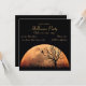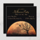 Lua laranja grande, brilhante, cheio com a silhueta de uma cerca quebrada, árvore e gato.