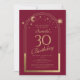 A Celestial Red Dourada Sun Moon Astronomy aniversário de 30 anos Invices apresenta um elegante sol dourado, lua e estrelas com um quadro de ouro sobre fundo vermelho. Dentro é a sua informação de convite de 30 anos. Personalize editando o texto nas caixas de texto. Projetado para você pelo Evco Studio www.zazzle.com/store/evcostudio