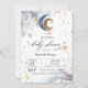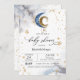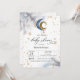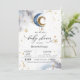 Luas celestiais e estrelas sobre fundo aquoso. Esses convites para chuveiros de bebês são facilmente personalizados para seu evento simplesmente adicionando seus detalhes.