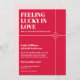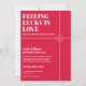 Tema moderno e mínimo do casamento "Lucky in Love" com quatro trevos de folha em formas cardíacas conectando corações de quatro lados em cores vermelho e rosa suave.