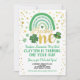 [Todo o texto é editável, exceto Lucky ONE] Convite de aniversário bonito no estilo. Tema: Shamrock & Rainbow. Primeiro Aniversário. Estilo: bonito, fofo, elegante. Cores: verde, branco, ouro. Gráficos: Arco-íris, shamrock, chapéu verde, ouro falso.