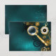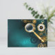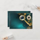 Uma lupa antiga com alça de ouro e lente convexa sobre fundo verde com engrenagens douradas e um relógio antigo. Estilo Steampunk.