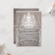 Convites de casamento de celeiro country encantador com um fundo de madeira rústica, um lustre vintage elegante, cortinas transparentes incrustadas com luzes cintilantes e texto de casamento moderno.