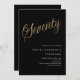 Um convite moderno e na moda para uma festa de aniversário 70 para ele e para ela. Fundo preto e a palavra Sessenta escrita com letras de ouro falsas. Personalize e adicione um nome e detalhes da parte.