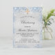 Um batizado moderno e elegante, celebrando um menino. Fundo metálico de aspecto fino prateado, decorado com poeira brilhante azul e uma cruz de ouro. Personalize e adicione um nome e detalhes da parte. Letras pretas coloridas.