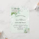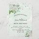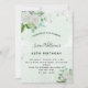 Um convite moderno, na moda e glamouroso para a 40ª festa de aniversário (ou qualquer idade) da mulher. Um fundo verde de cor aquosa, com poeira cinzenta prateada suja e florais brancos e verde. O nome é escrito com um moderno script estilo escrito à mão preta. Personalize e adicione um nome, idade e detalhes da sua festa