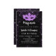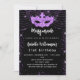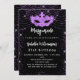 Para uma Mascarada elegante, 21ruas (ou qualquer idade) festa de aniversário. Um clássico fundo negro. Decorado com faxes roxos e uma máscara de mascarada. Personalize e adicione um nome, idade e detalhes da festa. O nome é escrito com um script de estilo manuscrito