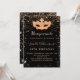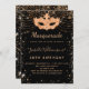 Para um Mascarada elegante, 50º aniversário (ou qualquer idade). Um fundo na moda preto. Decorado com pó dourado falso e uma máscara de mascarada. Personalize e adicione um nome, idade e detalhes da festa. O nome é escrito com um script de estilo manuscrito