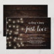 Linda Nada de Fantasia, Apenas Amor, Casamento Fuga de Noiva Anúncio / Convite de Festa, em Luzes de Corda de Fazenda Rústica Moderna, tema de papel marrom madeira. Isso é perfeito para o seu casamento e festa de celebração pós-casamento. Adicione seus detalhes em fonte / letra correspondente.