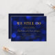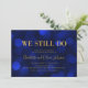 Convite de aniversário de casamento sofisticado com as palavras "We still do" em folha de ouro falso sobre um fundo de luzes bokeh azul safira na parte da frente e um fundo azul escuro na parte de trás. Este convite é perfeito para celebrar um aniversário de casamento de qualquer ano, bastando adicionar o número de anos que está sendo celebrado no texto do espaço reservado.
