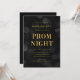 Convite de baile elegante com as palavras "Prom Night" em folha de ouro falso contra um fundo com padrão de luzes bokeh escuras. O convite tem um verso com fundo escuro.