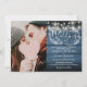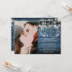 Um convite de casamento rústico com lindas luzes de corda e uma delicada guirlanda floral rústica desenhada à mão com folhagem botânica e tipografia elegante, sobre um fundo de madeira rústica azul. Personalize com sua foto especial e informações do dia do casamento. Criado por Thisisnotme©