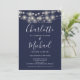 Com luzes de corda bonitas e nomes de estilo característicos, este convite de casamento elegante azul marinho e branco pode ser personalizado com todas as informações especiais do seu dia de casamento no verso, incluindo seu RSVP, acomodação e detalhes adicionais. Projetado por Thisisnotme