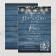 Um convite de formatura rústico com belas luzes de corda e potes de pedra com tipografia elegante, em um fundo de madeira azul rústica. Criado por Thisisnotme©