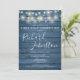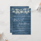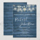 Um convite rústico para o primeiro comunhão com lindas luzes de corda, cruz dourada e um nome em letra cursiva elegante sobre um fundo de painéis de madeira azul. Personalize com as informações do seu evento especial. Criado por Thisisnotme©