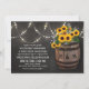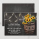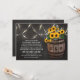 Convites de casamento country elegantes com um fundo de quadro-negro preto rústico, luzes cintilantes, girassóis amarelos dourados de verão, um barril de vinho de madeira com suas iniciais e um pedaço de corda amarrada.
