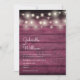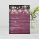 Um convite de casamento rústico elegante com lindas luzes de corda acima dos nomes do casal feliz, em uma fonte elegante acima dos detalhes especiais do casamento, em um fundo de madeira vermelha borgonha rústica. O verso apresenta um fundo de madeira rústica correspondente. Concebido por Thisisnotme