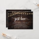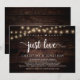 Nada de Luxo, Só Amor, festa de casamento simples, cartão de anúncio / convite de casamento, em madeira escura rústica moderna, design de luzes de corda. Isto é perfeito para a recepção do seu casamento e festa de celebração pós-casamento. Adicione seus detalhes em fonte / letra correspondente.