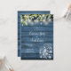 Um convite de casamento de jardim country chique com belas luzes de corda, jarros de pedreiro e folhagem verde de folhas de eucalipto frescas e naturais, emoldurando seus detalhes de casamento em escrita elegante e tipografia clássica em um fundo de madeira rústica azul. Projetado por Thisisnotme