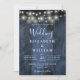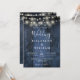 Este convite de casamento com luzes de corda de madeira de celeiro rústico azul pode ser personalizado com as suas informações em tipografia moderna. Concebido por Thisisnotme©