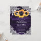 Convite de casamento roxo e girassol elegante com flores de girassol, luzes de corda e renda floral delicada contra um fundo de madeira rústica. Itens correspondentes disponíveis.